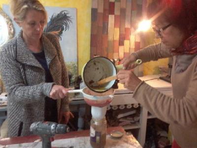 | filtrage de la prépartion du jour, un vernis marin noix de coco | atelier chimie, fabrication de produits écolo | stages palettes |