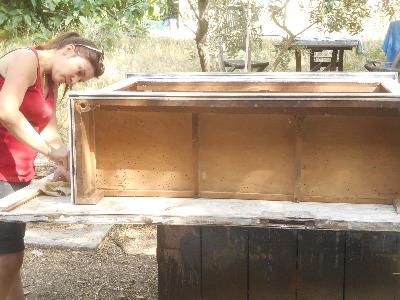| gravure sur bois avec la ponceuse lime, l'outil indispensable, sur fonc de peinture a la farine noire | patine a la cire d'abeille sur bois veiné (palette) sublime résultat | crétion originale pour cette console, initiation a la menuiserie palette |